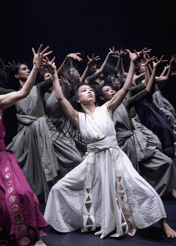 En escena, el lenguaje coreográfico de Khan —profundamente influenciado por el Bharatanatyam— se entrelaza con una dimensión visual de gran potencia y una dramaturgia sensorial que desplaza la obra hacia lo ritual. Allí, la memoria no se organiza como relato, sino como fragmento, resonancia y gesto compartido.