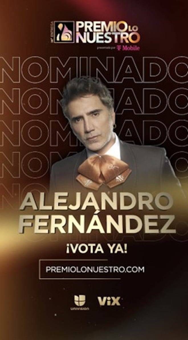 Presentado por Univision, Premio Lo Nuestro es el show de premios de mayor trayectoria en la televisión en español en Estados Unidos y se llevará a cabo en el Kaseya Center de Miami, FL, el jueves 19 de febrero de 2026. La transmisión en vivo se podrá ver por Univision a partir de las 8:00 p.m. ET/PT (7:00 p.m. CT). Los fans pueden votar por Alejandro Fernández en el sitio oficial de Premio Lo Nuestro hasta el 26 de enero.