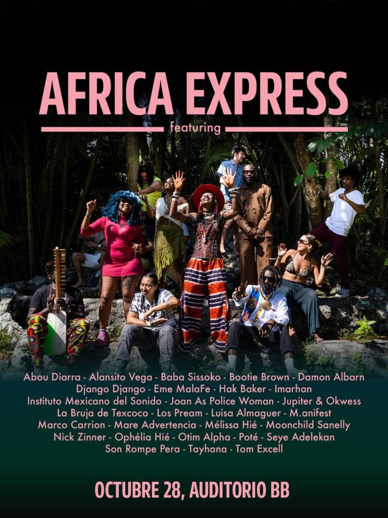 Africa Express regresará a México este mes con dos shows imperdibles, el domingo 26 de octubre en el Festival Cervantino (Guanajuato) y el martes 28 de octubre en el Auditorio BB (Ciudad de México). Estas presentaciones especiales reunirán al cofundador Damon Albarn con más de 50 artistas de cuatro continentes, desde Moonchild Sanelly hasta Django Django, Luisa Almaguer y Jupiter & Okwess.