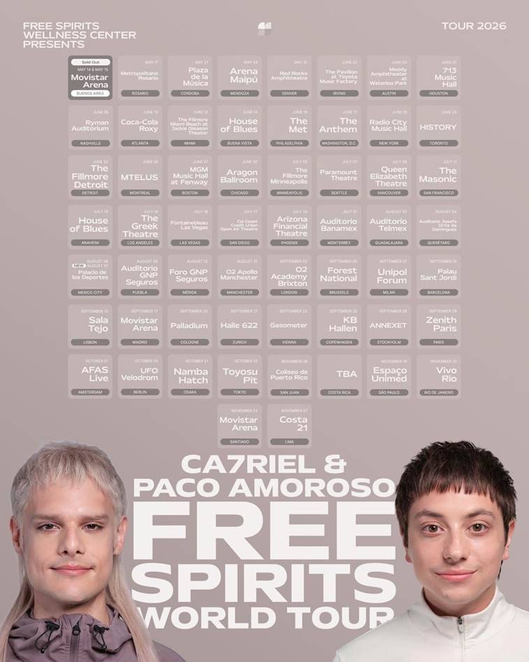 A lo largo de FREE SPIRITS, CA7RIEL & PACO AMOROSO amplían su ya impredecible mezcla de trap, rock, pop y espectáculo alternativo a algo más grande, más agudo y más emocionalmente desinhibido, sin perder el humor, la volatilidad y el talento musical que los han convertido en uno de los grupos más magnéticos surgidos de Argentina en este siglo.