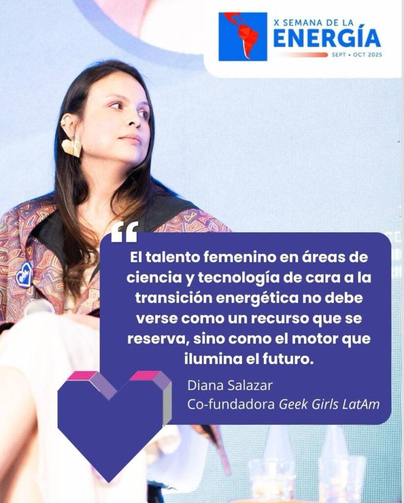 Diana Salazar, cofundadora de Geek Girls LatAm participó en la X Semana de la Energía organizada por OLADE en Santiago de Chile, durante la Sesión Magistral “Impulsando el Acceso de Mujeres a las STEAM en Energía en América Latina y el Caribe”, en este espacio resaltó la importancia de promover la participación femenina en el futuro energético de la región.