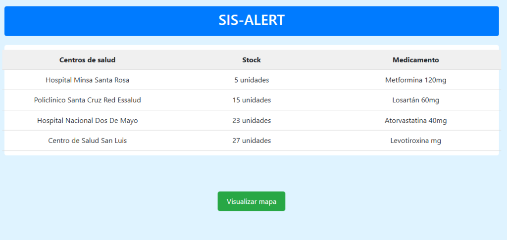 SIS Alert, plataforma con IA para garantizar abastecimiento de medicinas. Con el fin de mejorar la logística hospitalaria, un equipo de UTEC compuesto por Héctor López de la carrera de Bioingeniería, y Virginia Puente y Sofía Herrera, de Ciencia de la Computación crearon a SIS Alert, una plataforma basada en inteligencia artificial (IA) capaz de alertar sobre el estado del inventario de medicinas.