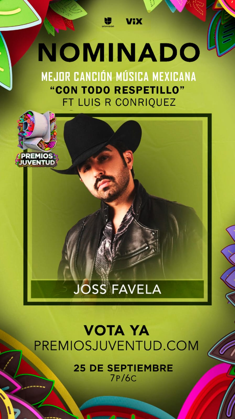 El día de hoy se dio a conocer la lista oficial de nominados en Premios Juventud y el talentoso cantautor Joss Favela suma un nuevo reconocimiento a su trayectoria, ya que su nombre aparece en la categoría ‘Mejor Canción Norteña Música Mexicana’ por su éxito “Con Todo Respetillo” el cual grabó junto a Luis R. Conriquez.