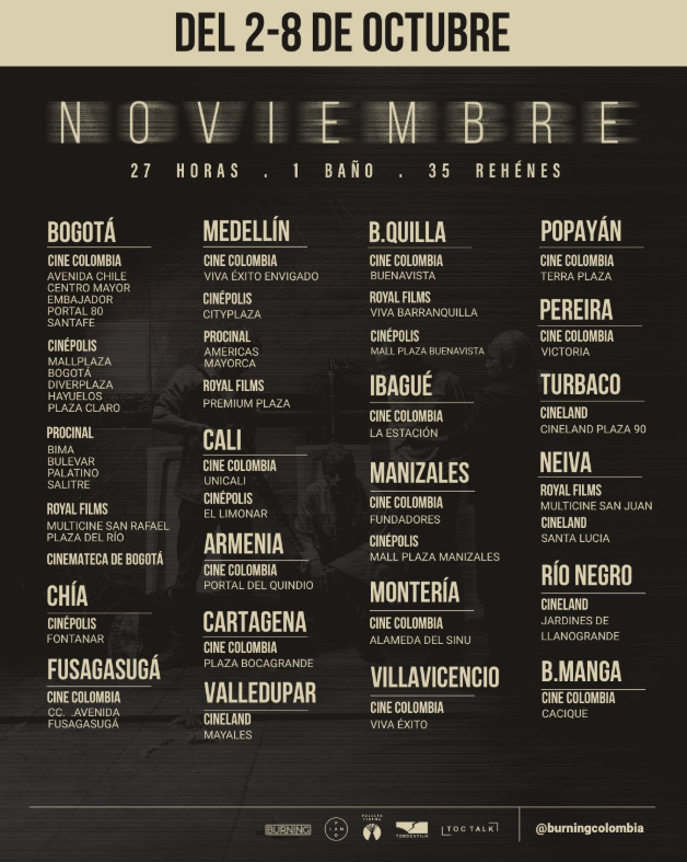 NOVIEMBRE estará disponible en más de 44 salas de 19 ciudades del país, entre ellas Bogotá, Medellín, Barranquilla, Cali, Cartagena, Bucaramanga, Pereira, Villavicencio, Neiva, Manizales, Ibagué, Popayán, Montería, Valledupar, Armenia, Fusagasugá, Chía, Rionegro y Turbaco.