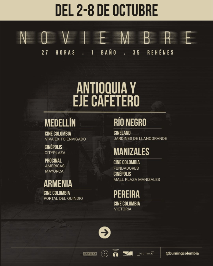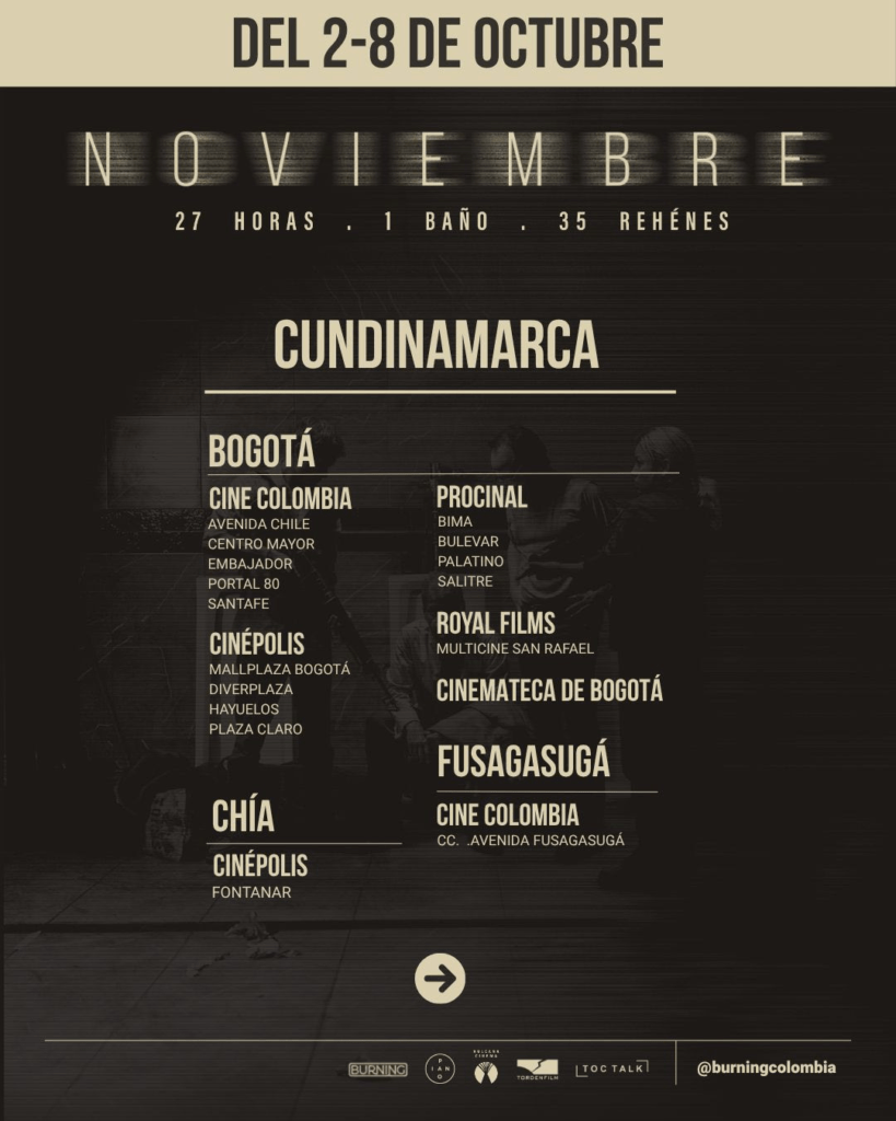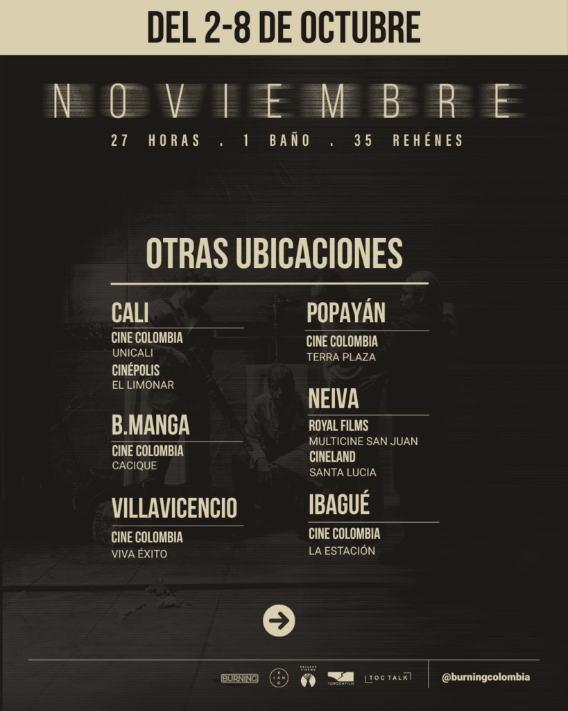 HOY, jueves 2 de octubre, llega a salas de cine de todo el país NOVIEMBRE, ópera prima del director Tomás Corredor, luego de su estreno mundial en el Festival Internacional de Cine de Toronto (TIFF) y antes de su participación en el Festival Internacional de Cine de Morelia y la Muestra Internacional de Cine de São Paulo. La película narra, desde una mirada diferente, uno de los episodios más dolorosos y complejos de la historia reciente de Colombia: la toma y retoma del Palacio de Justicia en 1985. Con su estreno en Colombia, la película abre un espacio de memoria y reflexión desde el cine, a pocos meses de la conmemoración de los 40 años de la toma y retoma.