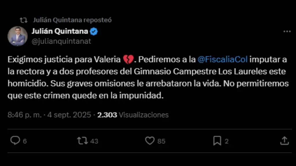 El abogado de la familia, Julián Quintana, pidió a la Fiscalía General de la Nación imputar cargos a la rectora y a dos docentes del colegio Gimnasio Campestre Los Laureles, al considerar que sus omisiones fueron determinantes en la tragedia.