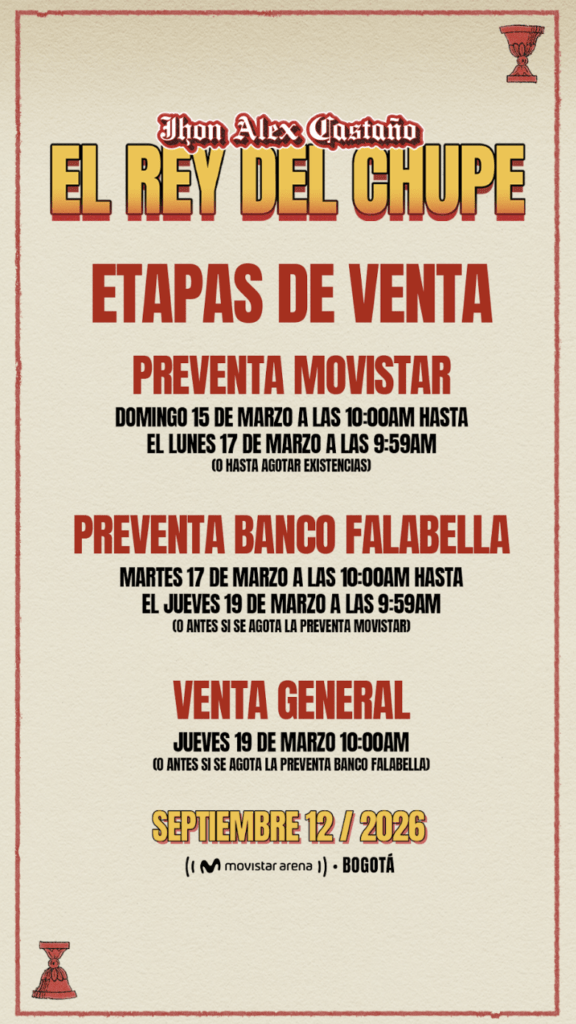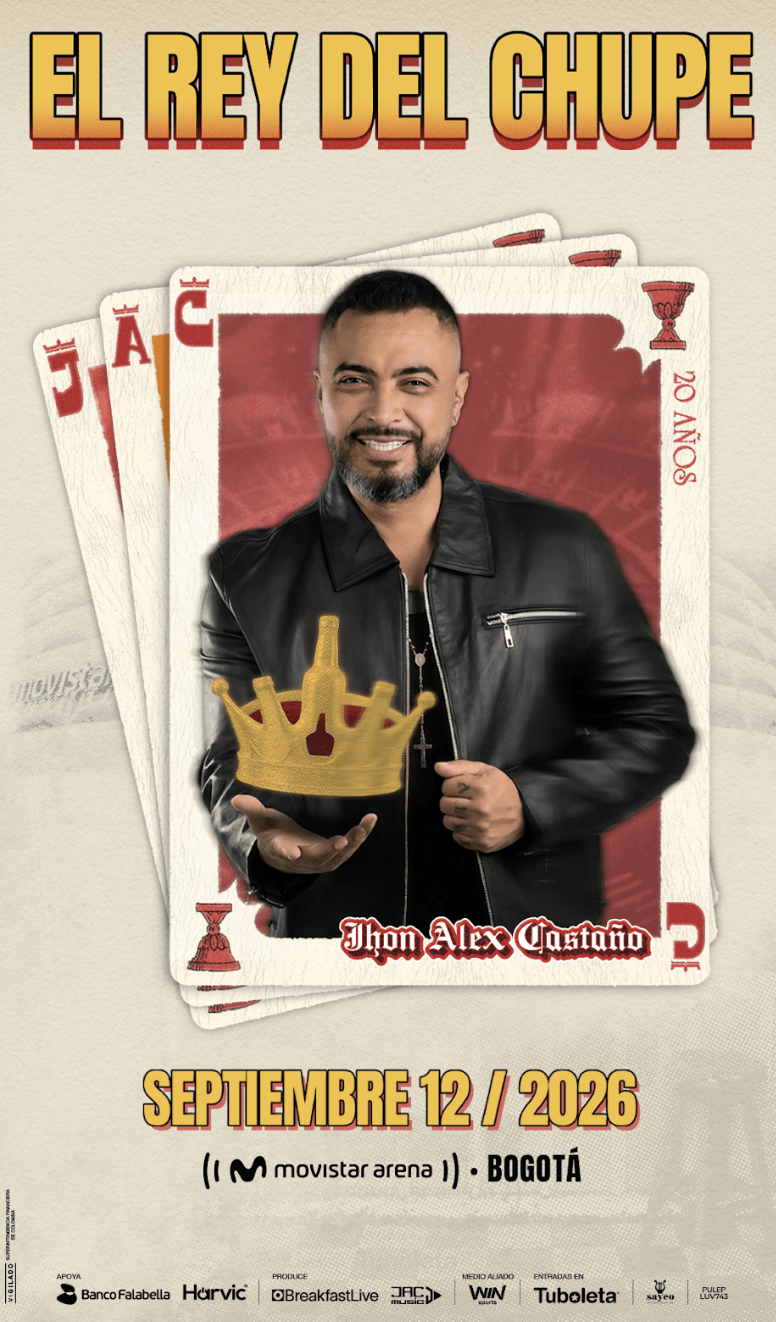Jhon Alex Castaño, uno de los grandes íconos del despecho en Colombia y conocido por todos como El Rey del Chupe, anuncia su primer concierto en el Movistar Arena de Bogotá, una noche histórica con la que celebrará 20 años de carrera musical y una vida entera cantándole al amor, al desamor, a la fiesta y a la vida misma.