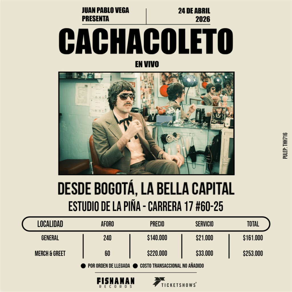 Juan Pablo Vega presenta “Cachacoleto”, un proyecto que existe en dos dimensiones: como álbum de estudio y como experiencia en vivo. El disco es un retrato sonoro de Bogotá, la ciudad donde el artista ha vivido, crecido y encontrado las músicas que moldearon su identidad. Más que un álbum, “Cachacoleto” es una celebración de la vida bogotana: sus calles, sus ritmos y las personas que la recorren y dejan eco en cada esquina.