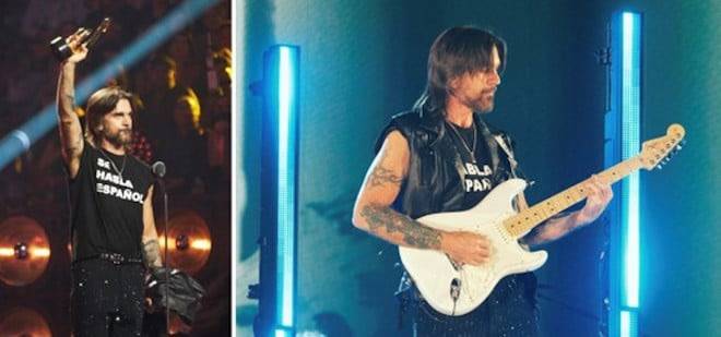“Una de las mejores presentaciones, Armado con una Fender eléctrica color hueso… y una camiseta que decía ‘Se Habla Español’, Juanes inició su set con carisma natural. Comenzó su medley con ‘Hagamos Que’, antes de sumergirse en los electrizantes riffs del clásico atemporal ‘La Camisa Negra’, demostrando su impacto incluso dos décadas después… para luego pasar a la suave y pop ‘Es Por Ti’. El ícono colombiano mostró una vez más por qué es considerado una leyenda viviente, una de las estrellas celebradas esta noche por sus incomparables contribuciones a la música latina. Acompañado por su banda, Juanes interpretó éxito tras éxito, incluyendo su inolvidable himno ‘A Dios Le Pido’, que desató la euforia del público. Los fans estaban extasiados, mientras las tomas del público cantando cada letra hacían palpable la emoción. Más tarde, Morat entregó a Juanes el Premio Lo Nuestro a la Trayectoria, honrando su extraordinaria carrera. Juanes cerró con un mensaje inspirador: ‘Aprendamos a tocar un instrumento, todos en casa, sin importar la edad. Hay mucha inteligencia artificial, pero nosotros tenemos inteligencia emocional y humana.’” – Billboard
