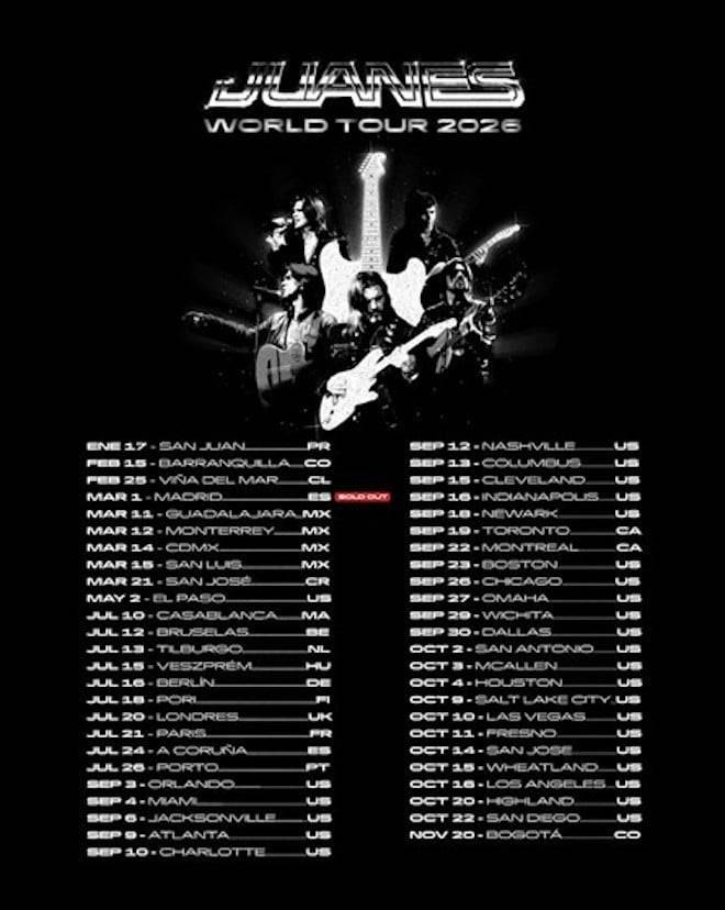 Tras presentarse recientemente como headliner en festivales de Puerto Rico y Barranquilla, JUANES volverá a liderar escenarios internacionales en los emblemáticos festivales de Viña del Mar (25 de febrero) y Vive Latino (14 de marzo). Además, ofrecerá un concierto único con entradas completamente agotadas el 1 de marzo en el Movistar Arena de Madrid. Posteriormente, Juanes World Tour 2026 continuará con fechas adicionales en México, Guadalajara, Monterrey y San Luis Potosí, una participación en un festival en Costa Rica, y un esperado regreso a Europa. La gira también incluirá una extensa etapa de 29 conciertos en arenas y teatros de gran capacidad a lo largo de Norteamérica, culminando con un emotivo regreso a casa el 20 de noviembre en el Movistar Arena de Bogotá.