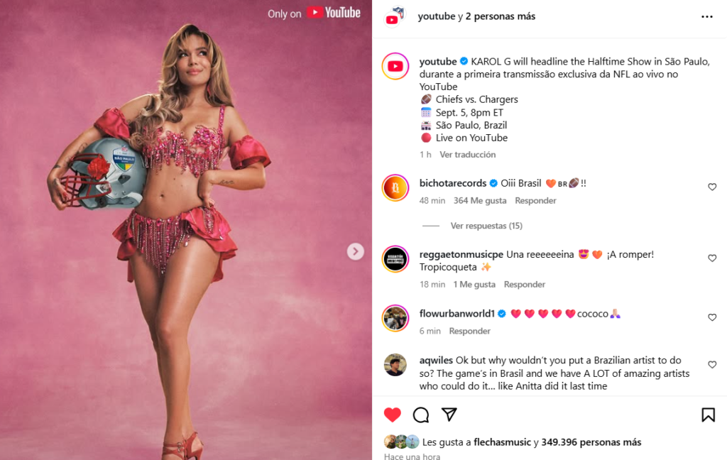 “Estoy muy emocionada de ser parte de la primera transmisión en vivo de la NFL por YouTube, es verdaderamente un honor y un momento del que estoy muy orgullosa de formar parte”, declaró Karol G en un comunicado. “He visto muchos shows de medio tiempo de la NFL a lo largo de los años, y ahora tener esta oportunidad de llevar mi música a este escenario global significa mucho para mí. No puedo esperar para celebrar con todos en São Paulo y con los fans alrededor del mundo”.