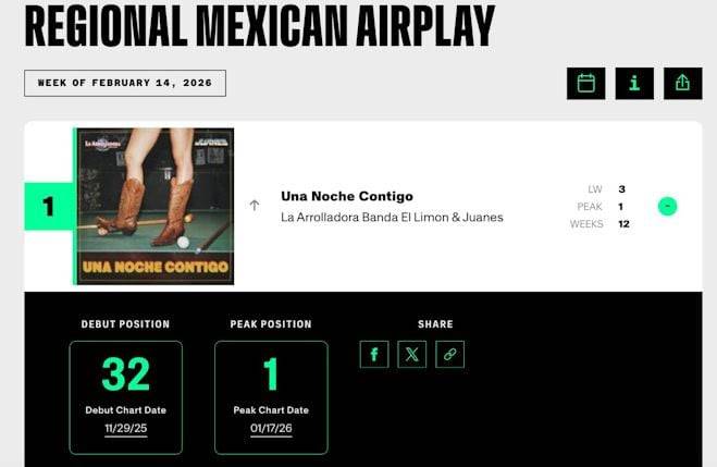 CDMX (10 de febrero, 2026) – La Arrolladora Banda El Limón suma un nuevo e histórico hito a su trayectoria al alcanzar por segunda vez el #1 en el listado Regional Mexican Airplay de Billboard con el tema “Una Noche Contigo”, una colaboración sin precedentes junto al múltiple ganador del Grammy, Juanes.