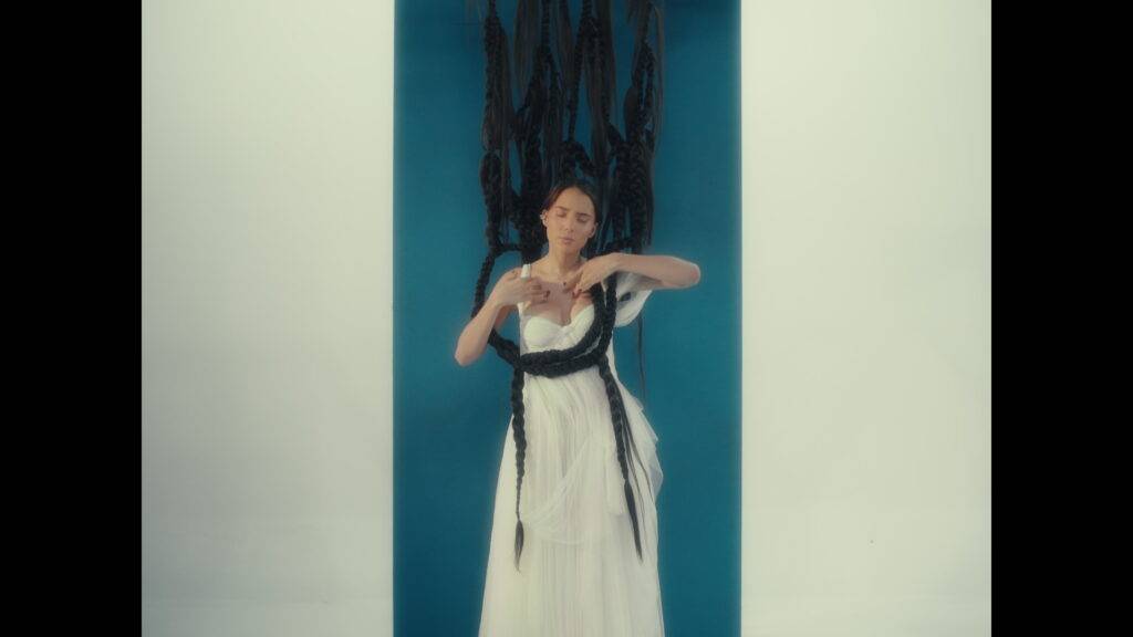 El video musical que la acompaña comienza con Majo sentada con un vestido completamente blanco sobre un fondo también blanco, creando un espacio casi infinito. Su larga cabellera trenzada la rodea mientras vierte emoción en cada letra, encarnando la intensidad y la vulnerabilidad de la canción. La imagen luego cambia entre este escenario etéreo y un plano contrastante de Majo de pie frente a una llamativa pared azul, con sus trenzas suspendidas sobre ella, reforzando una sensación de dualidad emocional y transición. A medida que se desarrolla la narrativa, se ve a Majo sentada frente a un espejo, cortando metódicamente sus trenzas hasta quedar con un corte pixie. Este acto constituye una poderosa liberación simbólica, que refleja la idea de que el cabello guarda recuerdos y que cortarlo representa un nuevo comienzo. En este momento, se convierte en una metáfora visual de desprenderse del bagaje emocional, recuperar el control y abrazar una renovada identidad.
