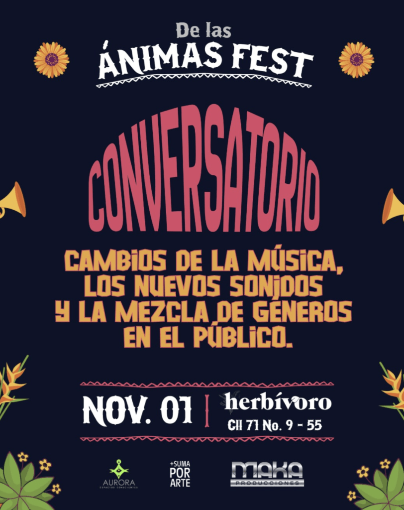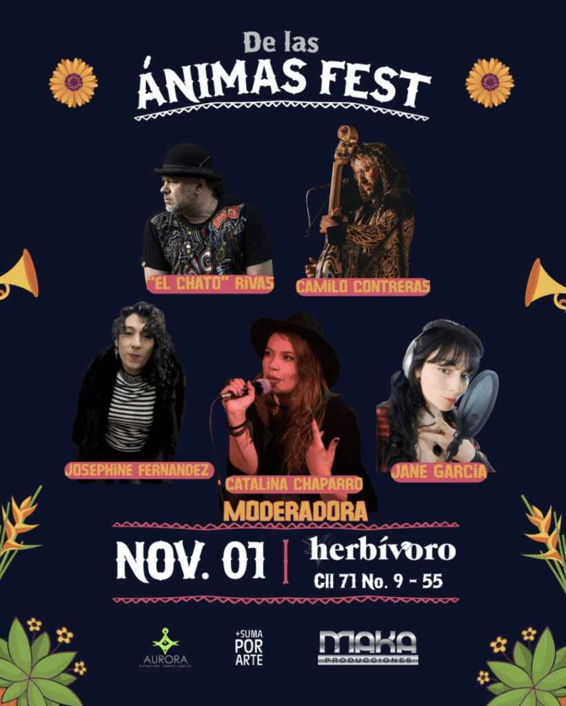 MAKA Producciones presenta ‘De Las Ánimas Fest’, el próximo sábado 1 de noviembre en Hervíboro, ubicado en la Calle 71 #9-55, desde las 4:00 p.m. La Pambelé, Queens Tafari, Discodelic DJ Set y Parra DJ, además de un conversatorio sobre la música actual.