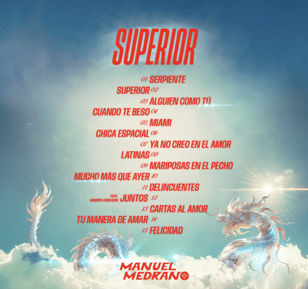 “Este álbum captura la esencia de mi performance en vivo y narra un poco de la historia de la música con la que yo crecí, “Superior” está compuesto, por un lado, A y un lado B, el lado A refleja una parte que muchos de ustedes no conocen de mí y está inspirado en el pop de los 80 y toda esa música de fiesta hecha con guitarras al ritmo del funk de artistas como Prince, Michael Jackson, Stevie Wonder, Nile Rodgers, Chic, entre otros… El lado B, en cambio, refleja mi faceta más íntima como cantautor y está inspirado en los grandes baladistas de la década de los 60, es una fusión atrevida y etérea que representa lo que soy y crea una propuesta cultural inmensa alrededor de todos los sonidos que componen esta obra”. Con estas palabras, el cantautor colombiano 2 veces ganador del Latin GRAMMY®️, Manuel Medrano, presenta “Superior”, su esperado cuarto álbum de estudio. Un proyecto que llega en el marco de la celebración por sus diez años de trayectoria artística y que refleja el momento más pleno, libre y luminoso de su carrera.