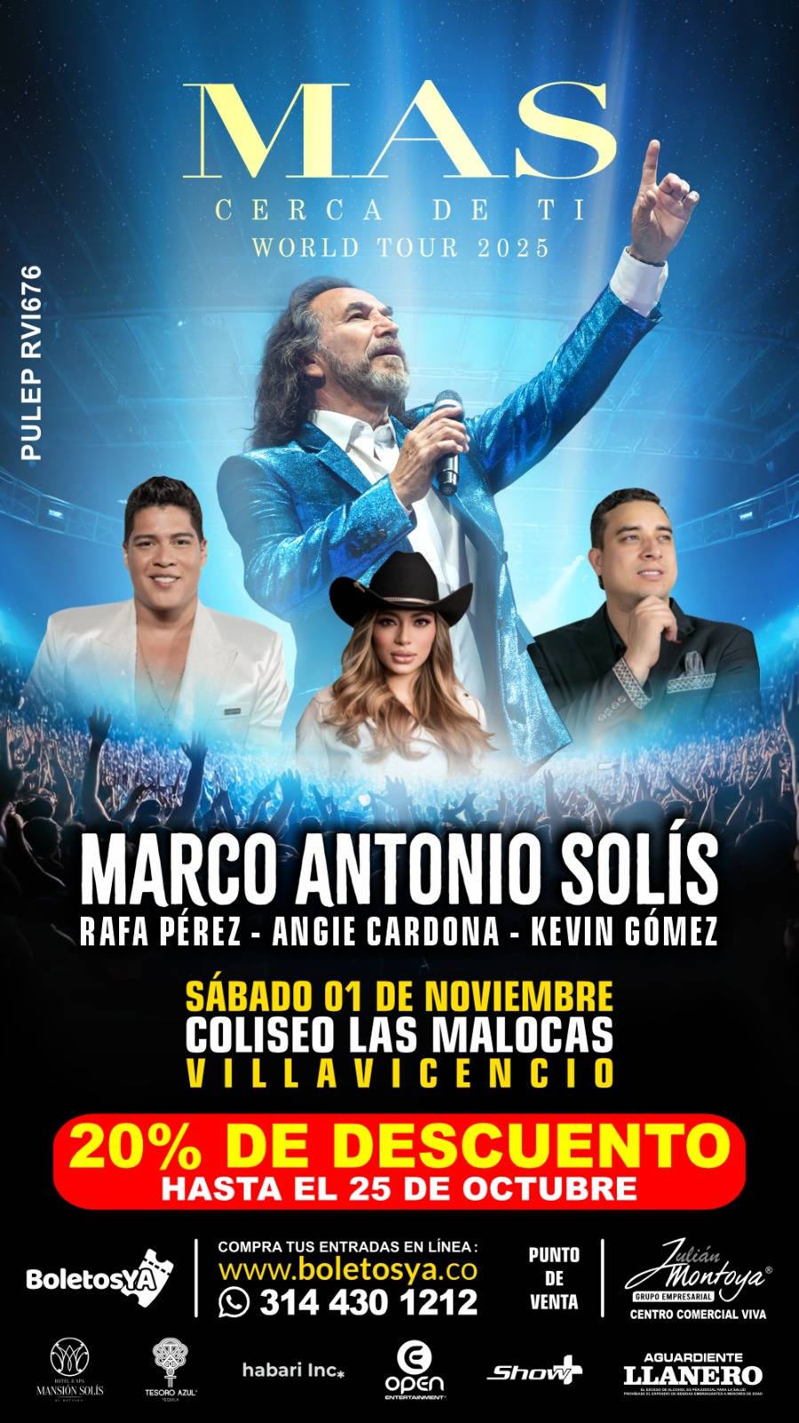 El público del “Más Cerca de Ti World Tour 2025” de Marco Antonio Solís en la capital del Meta, podrá apreciar este gran espectáculo el próximo sábado 01 de Noviembre en el Coliseo las Malocas desde las localidades de: ALFOMBRA ROJA, PALCOS DIAMANTE, ORO, PLATA, PLATINO, BRONCE, V.I.P. Y GRADERÍA.