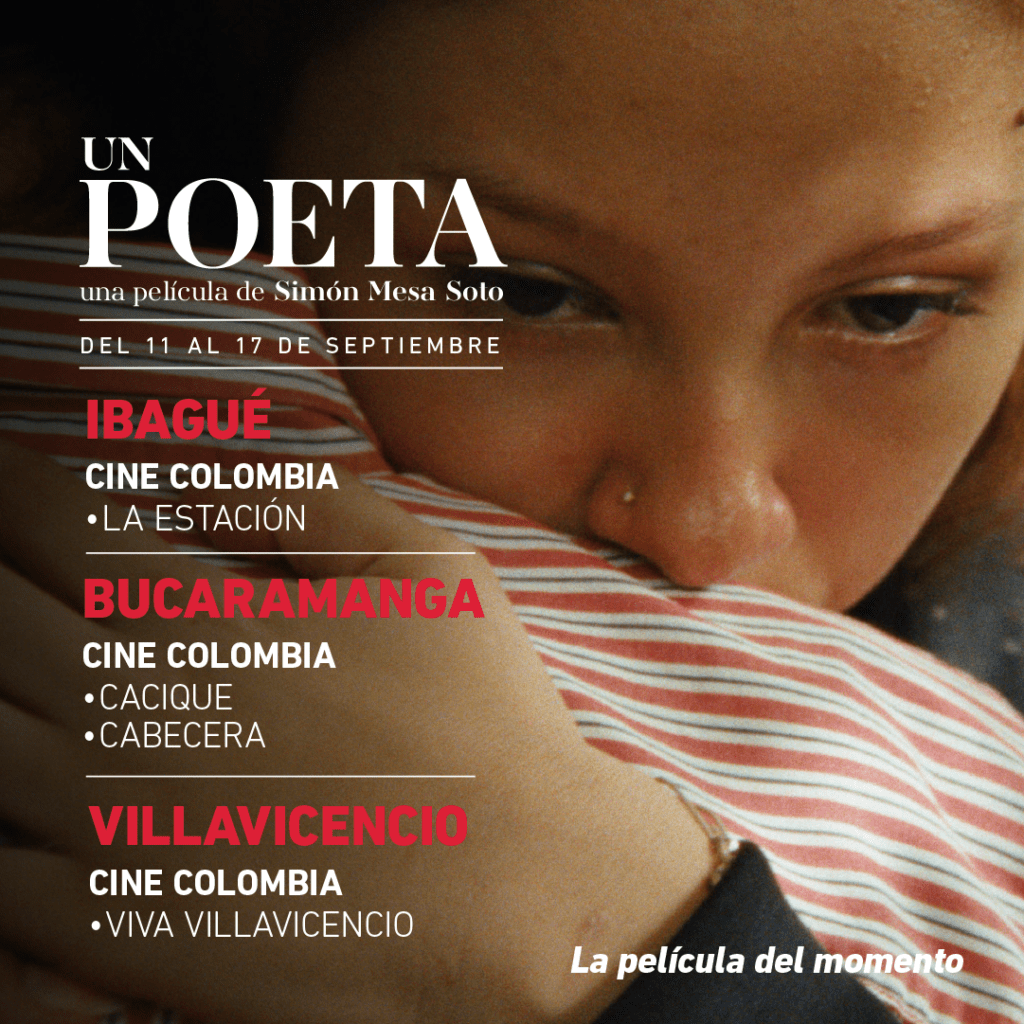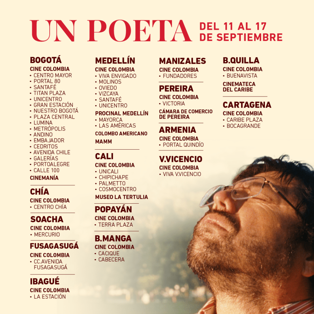 Del 11 al 17 de septiembre, UN POETA podrá disfrutarse en 15 ciudades del país: Bogotá, Medellín, Chía, Soacha, Fusagasugá, Ibagué, Cali, Popayán, Barranquilla, Cartagena, Villavicencio, Armenia, Pereira, Manizales y Bucaramanga.