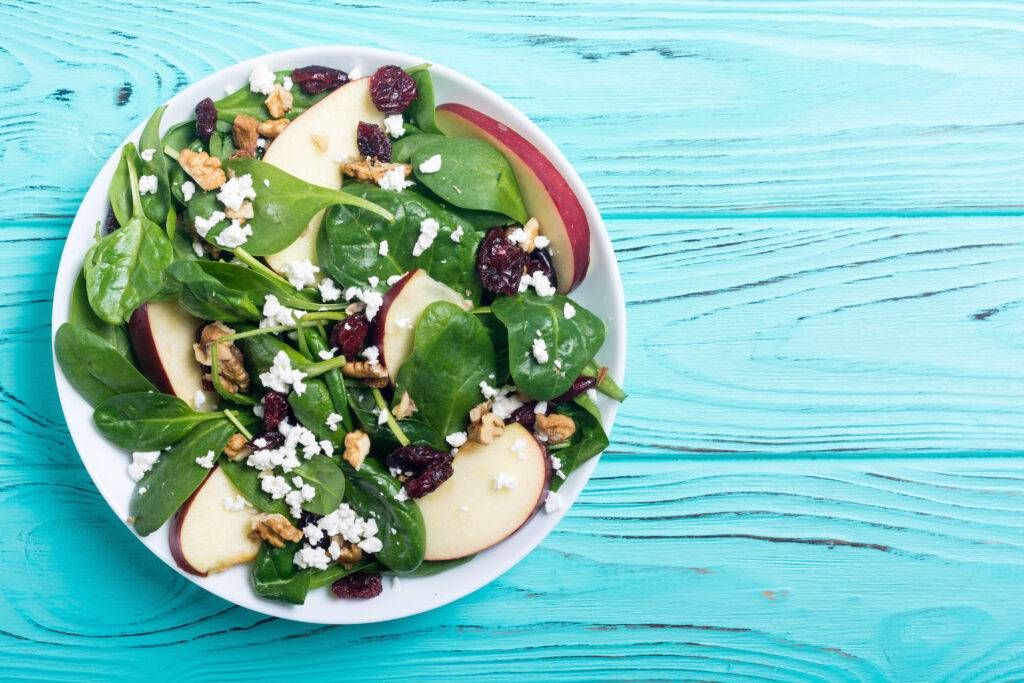 Las hojas verdes (espinaca o rúgula), combinadas con manzana verde, queso feta y cranberries, logran una mezcla equilibrada entre dulzor, acidez y cremosidad.
