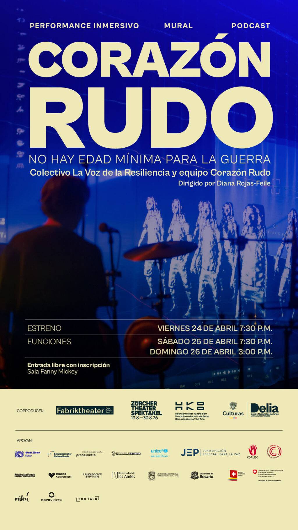 Como eje central del proyecto, se presenta la performance inmersiva Corazón Rudo, que tendrá funciones los días 24, 25 y 26 de abril en la Sala Fanny Mickey del Centro Nacional de las Artes Delia Zapata Olivella. La obra combina video, música en vivo, instalación audiovisual y testimonios para construir una narrativa desde memorias fragmentadas. A través de una experiencia sensorial con auriculares y composición sonora en vivo, propone un acercamiento íntimo a estas historias, preservando el anonimato de sus protagonistas y situando al espectador en un ejercicio profundo de escucha.