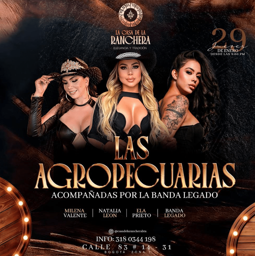 Bogotá, enero — Este jueves 29 de enero, La Casa de la Ranchera será escenario de las mejores voces femeninas de la actualidad en el show “Las Agropecuarias”, uno de los eventos temáticos más destacados de la ciudad, que reunirá lo mejor de la música popular y Regional Mexicana, como parte de su programación de entretenimiento en vivo de la zona de la “83” de Bogotá.