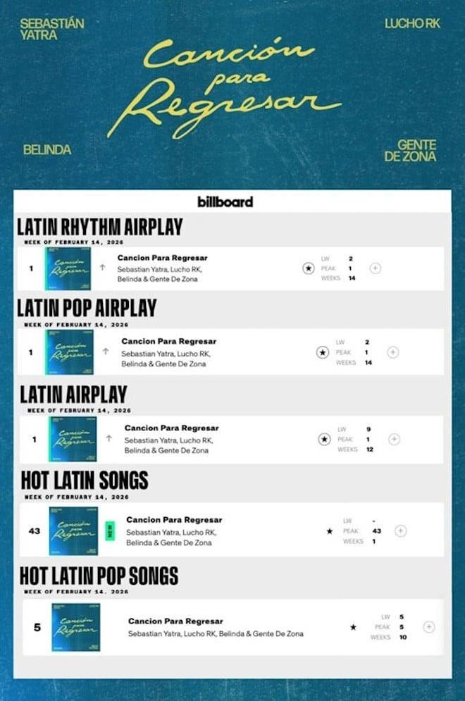 El lanzamiento llega en un momento especialmente activo para el artista. Sebastián Yatra se presentará en Premio Lo Nuestro 2026 junto a Gente de Zona para interpretar “Canción Para Regresar”, tema que recientemente alcanzó el #1 en los listados Latin Airplay, Latin Pop Airplay y Latin Rhythm Airplay de Billboard, sumando un nuevo liderazgo a su historial en la radio latina, donde ya acumula 13 entradas y múltiples posiciones #1 a lo largo de su carrera, además de debutar en el listado Hot Latin Songs. Este año, Yatra cuenta con cuatro nominaciones al galardón en las categorías Pop – Male Artist of the Year, Pop – Song of the Year por “La Pelirroja”, Pop – Album of the Year por su proyecto Milagro y Pop/Urban – Collaboration of the Year por “2am” junto a Bad Gyal.
