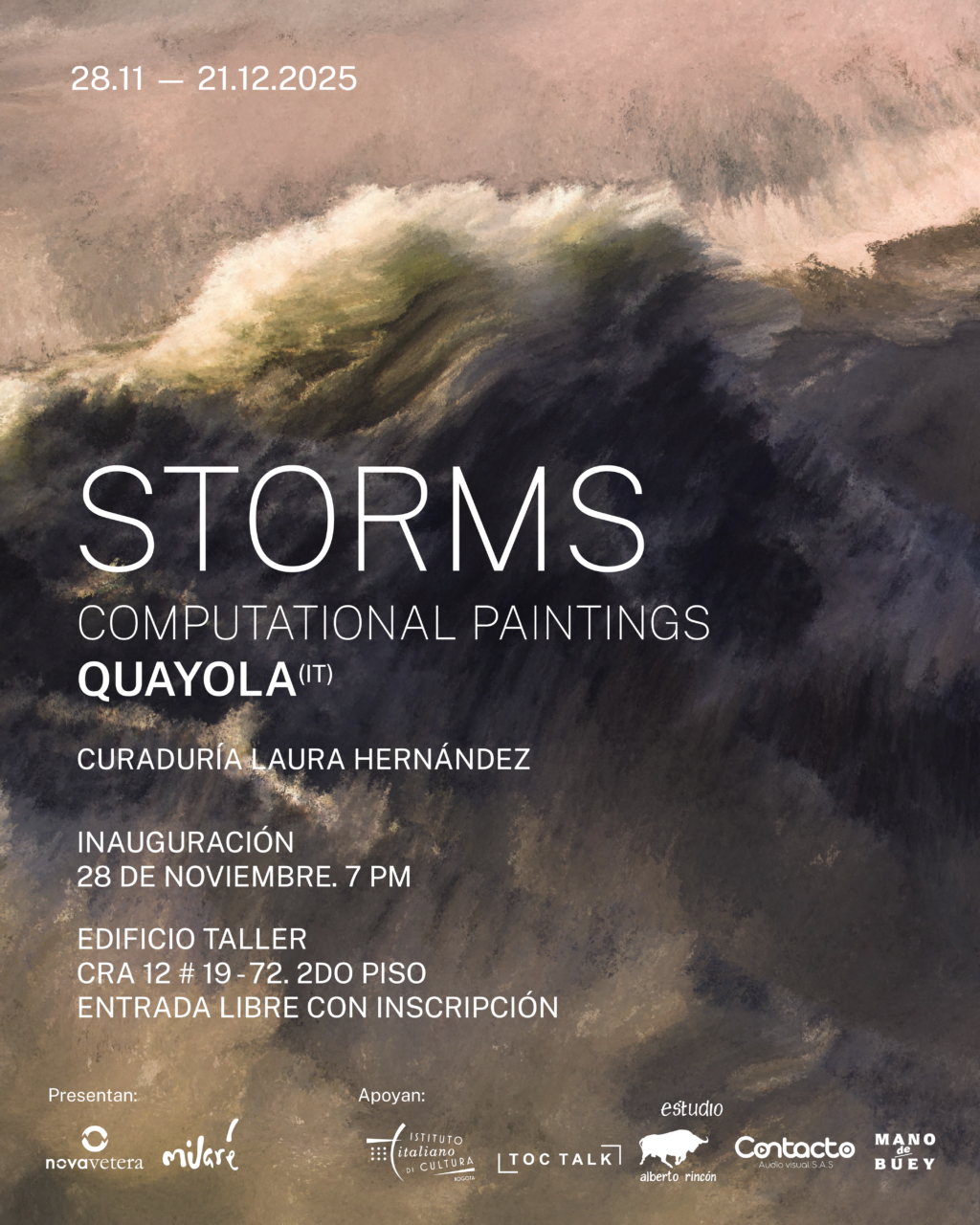 Hoy 28 de noviembre, el artista digital italiano Davide Quagliola (Quayola) inaugura en Bogotá la videoinstalación STORMS / COMPUTATIONAL PAINTINGS, una exploración sobre cómo la tecnología transforma nuestra manera de ver el paisaje. La muestra estará abierta al público hasta el 21 de diciembre en el Edificio Taller (Cra 12 #19-72), un espacio que, además de ser sede de Muaré Costumes, alberga el Taller Giangrandi, dirigido por el maestro colombo-italiano Umberto Giangrandi, pionero activo en la gráfica contemporánea del país y figura central en la experimentación y enseñanza de técnicas de impresión.