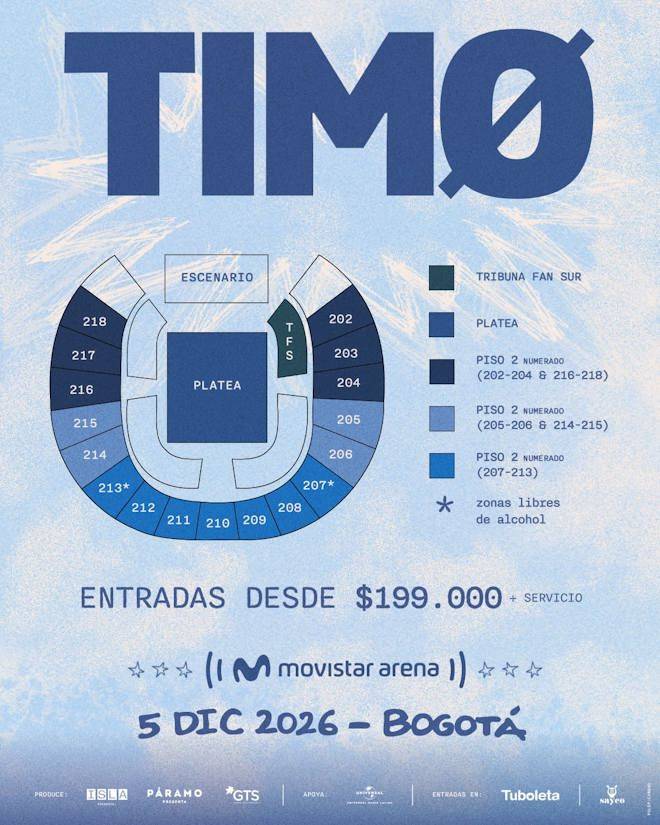 | El primer anuncio se dio de una forma muy emotiva e inolvidable durante su presentación en el Festival Estéreo Picnic, cuando, en medio de la interpretación de su canción “Luz”, un mensaje apareció frente a miles de asistentes: “Bogotá, en diciembre, nos vemos, Movistar Arena”, desatando la euforia del público.Ahora, desde el Movistar Arena de Bogotá, TIMØ anuncia oficialmente la fecha de su tan anhelado Movistar Arena en la ciudad que los ha visto crecer y triunfar.Este importante logro para su historia musical como banda, llega en paralelo al lanzamiento de su más reciente álbum, Canto Pa No Llorar, un trabajo que consolida la identidad sonora de la banda al transformar la nostalgia en energía luminosa. Un viaje sonoro con raíces latinas y espíritu dosmilero, el cual rinde homenaje a la era dorada del pop latino de los 2000El álbum, que navega entre la melancolía y la celebración, se ha convertido en un refugio emocional para sus oyentes, reafirmando la conexión única de TIMØ con su público. |