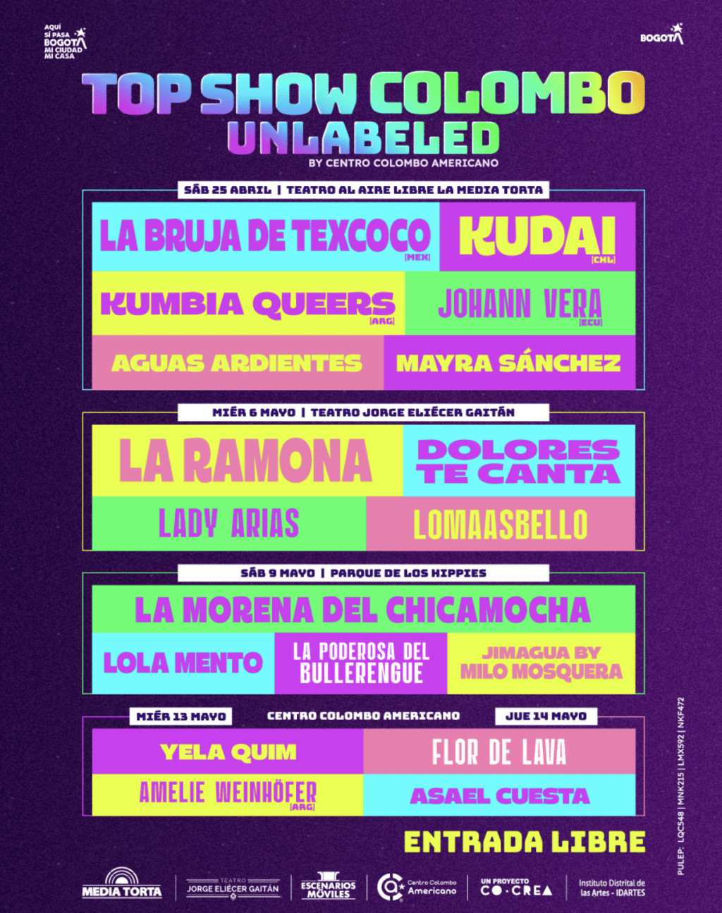 Bogotá será nuevamente escenario de uno de los festivales culturales más importantes y gratuitos del país. En su sexta edición, el Top Show Colombo presenta una apuesta contundente por la diversidad con la edición Unlabeled (Sin Etiquetas) #SinEtiquetas, un encuentro que reunirá a 18 agrupaciones nacionales e internacionales , que espera convocar a más de 20.000 asistentes en cinco fechas de conciertos y actividades pedagógicas. El Festival tendrá lugar del 25 de abril al 14 de mayo en cinco escenarios distintos, a lo largo de la ciudad: el Teatro al Aire Libre la Media Torta, el Teatro Jorge Eliécer Gaitán, el Parque de los Hippies y el Centro Colombo Americano.